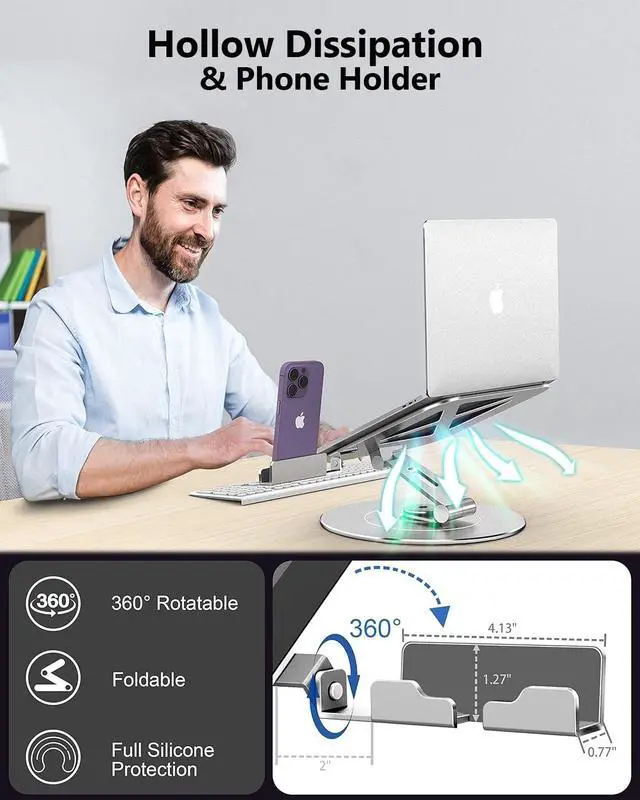 SAVING & EASY TO CARRY]: Portable Laptop Stand with Phone Holder. The all-in-one foldable laptop stand is very convenient to carry. You can put it in your backpack or suitcase and take it to the office, coffee shop or even anywhere you travel. Accompany you in giving wonderful speeches in the conference room, improve your work experience, and keep your desk tidy. So much so that you can use this folding laptop stand anywhere. ^^ *Warm Tips* The laptop stand is relatively large, with a base diameter of about 280mm. It is recommended to plan the desktop space reasonably.