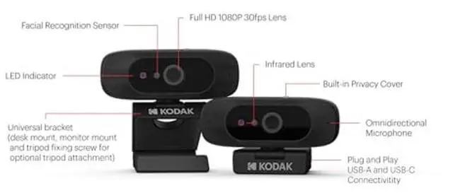 SECURITY: The KODAK Webcam is the perfect solution for ensuring security with its Windows Hello compatible facial recognition sensor. With this feature, you can be confident that your device is secure. Its integrated privacy cover gives you peace of mind that you are hidden while the cover is closed. Additionally, you can trust the source of its components with this TAA Compliant camera.