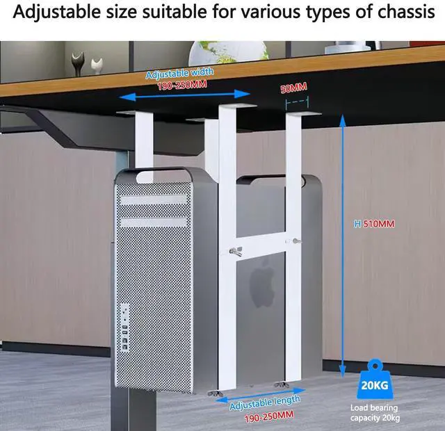 The UNDER DESK MOUNT CPU STAND is designed for easy installation and durability, providing a secure and adjustable space for your PC TOWER STAND UNDER DESK. Ideal for office and gaming environments, this SPCC Cold Rolling Steel construction can support up to 25kgs, ensuring your computer remains stable. ^^ Featuring a height of 520mm and width adjustable from 190-250mm, this PC DESK MOUNT fits 99% of computer host cases with a height less than 500mm and thickness between 130-240mm. The versatile design allows for customization to fit various desk setups. ^^ The PC UNDER DESK MOUNT is engineered to keep your computer tower off the FLOOR, reducing the risk of damage from moisture and making cleaning easier.