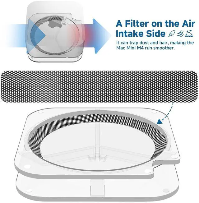Perfect Fit for 2024 Mac Mini M4/M4 Pro - Designed specifically for the 2024 Mac Mini with M4/M4 Pro chips. Ensures secure placement and full compatibility with ports/ventilation. ^^ Built-in Air Filter Blocks Dust - Integrated PVC filter prevents dust buildup inside the Mac Mini M4/M4 Pro. Maintains internal cleanliness for long-term performance. ^^ 0.59 -Inch Elevation Improves Cooling - Elevated design increases airflow under the Mac Mini M4. Reduces heat accumulation with all sides ventilation for stable operation. ^^ Easy Power Button Access - Precision-cut opening lets you press the bottom power button instantly.