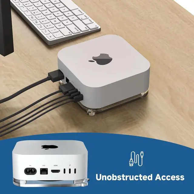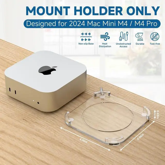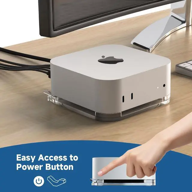 Mac Mini M4 Stand - Designed exclusively for the 2024 Mac Mini, this desk stand is an ideal match for models equipped with the M4/M4 Pro chip. ^^ Protective and Stable - Made of high quality acrylic, this desktop Mac mini m4 mount stand is stylish and durable. he base and feet have small non-slip rubber pads to prevent your Mac mini from falling. No assembly required, very easy to use. ^^ Convenient Access to Power Button - A cleverly designed push-button mechanism inside the flat stand provides easy access to the power button on your Mac mini m4.