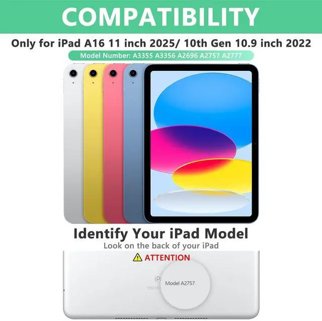 Generation: The keyboard case is compatible with iPad A16 11 inch 2025 (A3354/A3355/A3356) and compatible with iPad 10th Generation 10.9 inch 2022 (A2757/A2777/A2696). Not for other iPad models. Please carefully check the model number on the back of your tablet ^^ Detachable