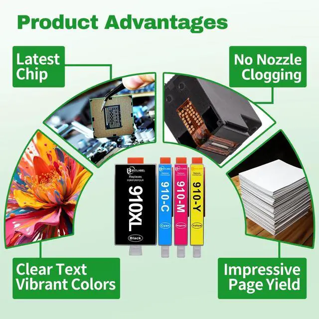 ^^ Package Contents: 1 x 910XL High-Yield Black Ink Cartridge, 1 x 910XL High-Yield Cyan Ink Cartridge, 1 x 910XL High-Yield Magenta Ink Cartridge, 1 x 910XL High-Yield Yellow Ink Cartridge 4-pack in total, perfect for high-volume printing needs. ^^ Exceptional Page Yield for