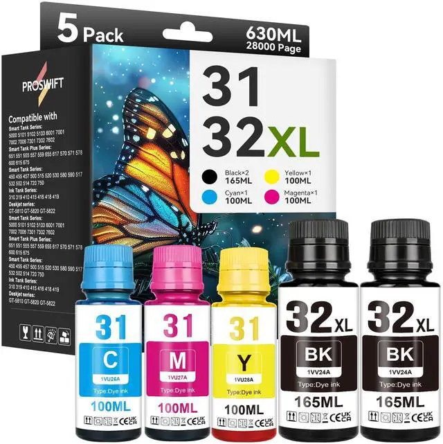 Compatible Printers: 32XL black ink bottle 31 ink bottle set compatible replacement for HP Smart Tank Printer 7602 6001 7301 5100 5101 5000 5102 757 7601 755 7601 6002 7302 7001, HP Smart Tank Plus 651 551 wireless all-in-one etc. ^^ Higher Yield Page 31 32XL ink bottle