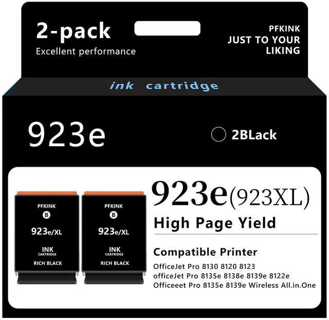 The packaging includes: PFKink cartridges (923e, 2black set) replacement for HP 923e Black ink cartridges.