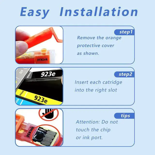 Ink level display chip: The smart chip can display our 923e ink level, so you can decide in advance whether you need to order a new ink cartridge. ^^ The PFKink 923xl ink cartridge undergoes strict control before leaving the factory and has obtained ISO9001 and MSDS certifications