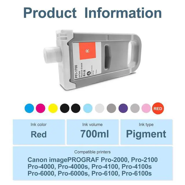 Tpye: PigmentCompatible printercompatible with Canon imagePROGRAF PRO-2000, PRO-2100, PRO-4000, PRO-4000s, PRO-4100, PRO-4100s, PRO-6000, PRO-6000s, PRO-6100, PRO-6100s