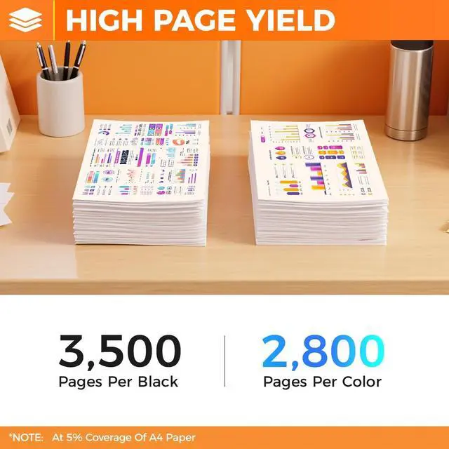 ^^ Page Yield: Up to Black is 3, 500 pages per black cartridge and Color is 2, 800 Pages per color cartridge (Letter/A4, at 5% Coverage).