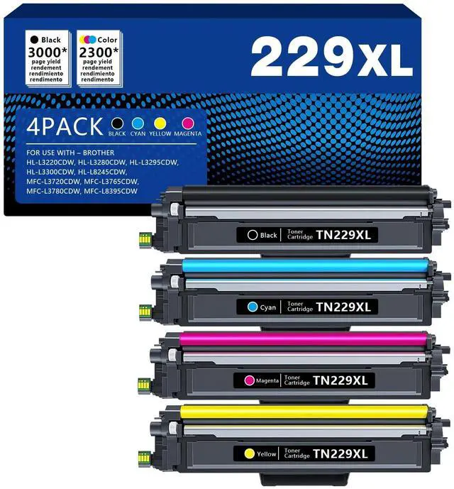 Package Contents: 1 x User Guide, 1 x TN229XL TN229 XL Black toner, 1 x TN229XL TN229 XL Cyan toner, 1 x TN229XL TN229 XL Magenta toner, 1 x TN229XL TN229 XL Yellow toner (Total 4 Pack With Chip)