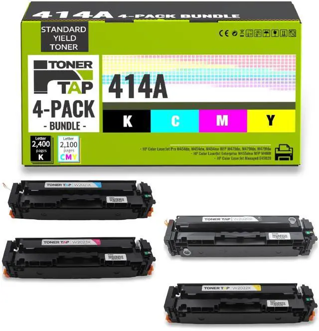 Standard-Yield 414A Color BundleThis 414A toner cartridges 4-pack includes Black (W2020, 2, 400 pages), Cyan(W2021A, 2, 100 pages), Magenta(W2023A, 2, 100 pages), and Yellow (W2022A, 2, 100 pages). For higher volume printing, the 414X high-yield 4-pack is designed to be more cost-effective over time. ^^ True-to-Life Color with Japanese TonerOur 414A toner cartridges are engineered with TonerTap Japanese toner to deliver exceptionally accurate, true-to-life color. Experience vibrant hues and deep blacks that match what you see on your screen, providing professional-grade results for presentations, photos, and marketing materials.