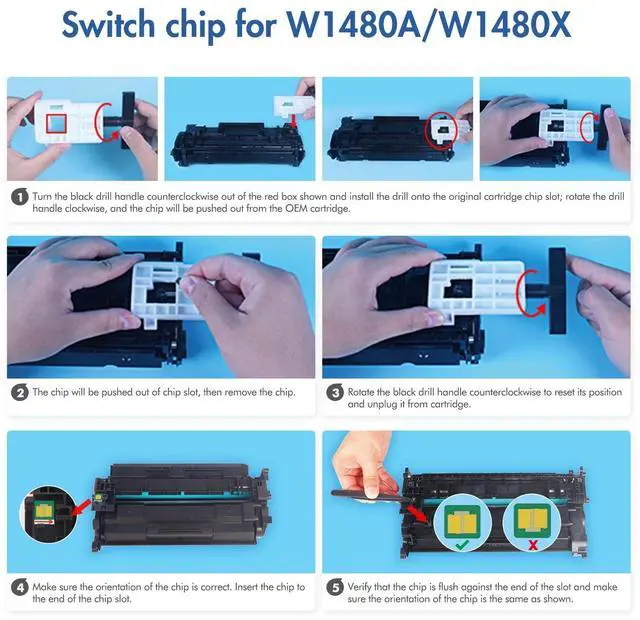 No Chip: These W1480X 148X toner cartridges do not have chips, and need to transfer chip from original 148X toner. Please follow user instructions and use the tools provided to complete the chip