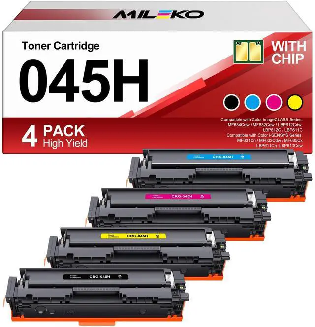 Package Content: For 045h toner cartridges compatible canon mf632cdw toner include (1 x 045H Black, 1 x 045H Cyan, 1 x 045H Yellow, 1 x 045H Magenta) ^^ 5. MILEKO compatible canon 045 toner cartridges replacement for canon mf632cdw toner provide clear and vibrant printing