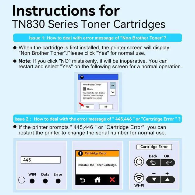 so as to Make The Documents Become More Professional ^^ TN830XL Friendly TipIf the printer displays '445, ' '446, ' or 'Cartridge Error, ' please restart the printer to resume normal operation.
