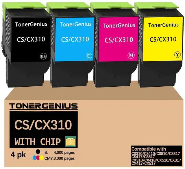 C/M/Y: 3K) ^^ Package Contents4-pack CS310 CX310 toner cartridges Compatible with Lexmark CS310/CS410/CS510/CS317/CS417/CS517 CX310/CX410/CX510/CX317/CX417/CX517 with intelligent tracking chips. Factory-sealed packaging ^^ Quality Assurance24-month after-sales support is provided for the CS921 CX921 toner cartridges Compatible with Lexmark CS310/CS410/CS510/CS317/CS417/CS517 CX310/CX410/CX510/CX317/CX417/CX517 ^^ With ChipCS310 CX310 toner cartridges Replacement toner cartridges is already equipped WITH CHIP Compatible with Lexmark CS310/CS410/CS510/CS317/CS417/CS517 CX310/CX410/CX510/CX317/CX417/CX517. Pre-installed chips ensure seamless printer recognition - no chip transfer required. No damage to the drum and printer.