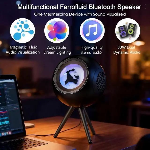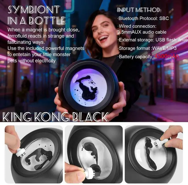 Novel Venom Speaker Inspired by the ferrofluid substance in the Marvel movie "Venom", Venom ferrofluid speaker that is sleek and modern, is in response to external sounds and music, creating a captivating audio visual experience, making it an ideal decoration to your home, office or party ^^ Vibrant Dreamy LightingThe Ferrofluid Music Rhythm Visualizer features built-in RGB lights that automatically change colors. You can also switch to your favorite color or adjust the light brightness by touch the "Light" icon. It will become a unique decorative light on your desktop ^^ Dual Channel Stereo SpeakerThanks to dual channel speakers, the desk ferrofluid speakers for computer delivers surprisingly loud and balanced sound, complete with rich bass and clear soundit fills rooms well, making it perfect for music lovers or livening up party vibes as desk speakers, pc speakers or computer speakers ^^ TWS-360 Stereo FunctionTWS-360 Stereo pairs two ferrofluid speakers wirelessly for a complete 360 soundstage all-encompassing sound experienceperfect for home theater, parties, or wherever life takes you ^^ Suitable for Multiple ScenariosAll-in-one magnetic fluid audio visualizer can be used as a music companion and Bluetooth computer speakers, a creative desk toy, a ferrofluid display, a stress-relief toy, a ferrofluid dancing lamp, and even as a piano metronome.