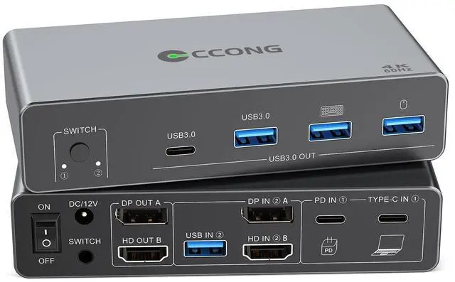 HDMI+Displayport USB C KVM Switch Dual monitorCCONG KVM switch 2 monitors 2 computers built with 1x USB-C (MST) input port for laptop, and 1x integrated HDMI +Displayport+ USB-A input port for desktop. Allows you to effortlessly manage 1 Laptop and 1 Desktop to share 2 monitors and 4 USB devices together. Switch easily between your work PC and personal laptop. ^^ Ultra HD 4K