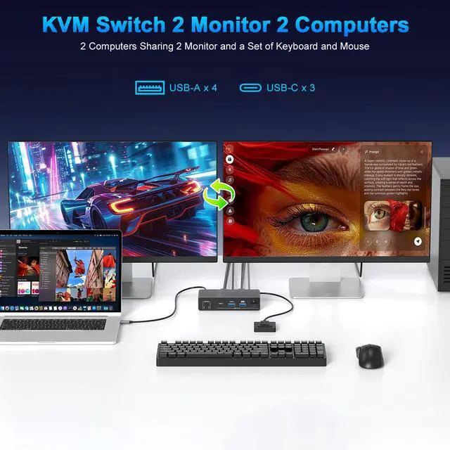 Quickly Charge Your Laptop: With the 100W USB-C charging port, you can quickly charge your laptop while using this 2 monitor KVM switch (Please use a USB-C port power adapter). ^^ Great Compatibility & 2 Switching WaysThis 2 computers 2 monitors switch driver-free for Windows, Mac OS, Linux and Chrome OS. Compatible with Desktop, Laptop and mini box. It is widely applied for home, office, games, etc. You can press the button on the panel or use the wired remoteincluded to switch the computersLED indicate the active computer.