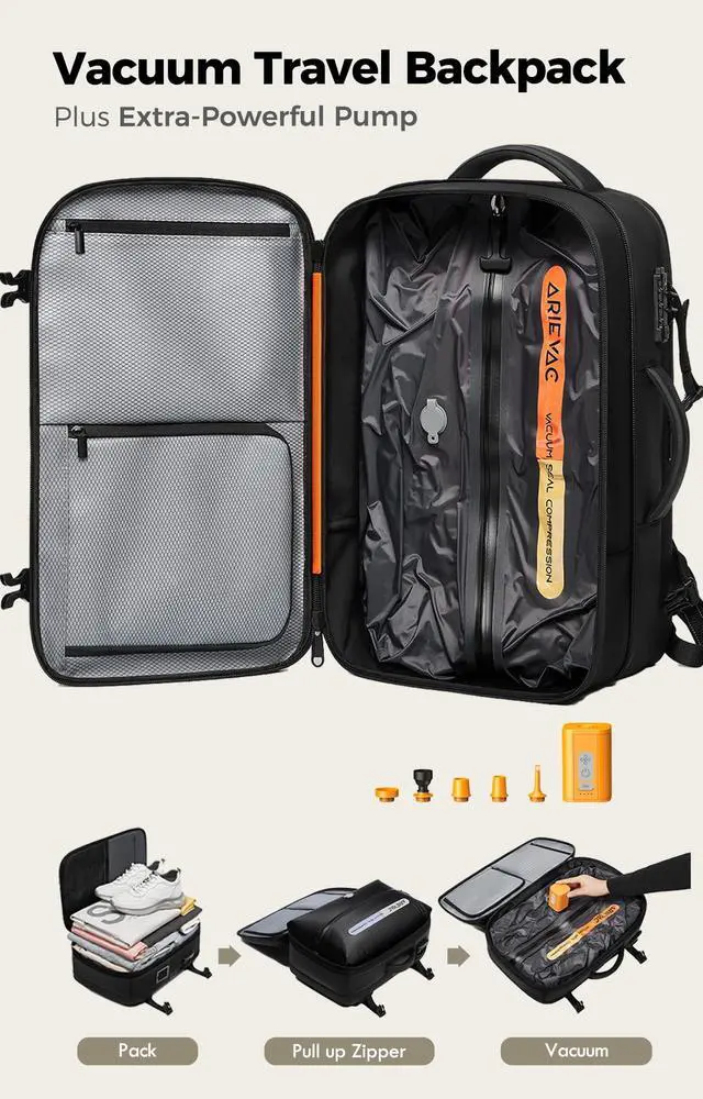 Upgraded Vacuum Compression & 80L Max CapacityDesigned with an enlarged vacuum compression bag, this backpack maximizes usable space and keeps clothing compact and organized, easily fitting 12 weeks of travel essentials in one bag. Paired with an upgraded external electric air pump, the system delivers stronger, more efficient suction for faster compression, helping reduce clothing bulk and save packing time while keeping everything neatly compressed throughout your trip ^^ Carry-On Friendly with TSA Lock Compact 20" x 12" x 7.8" design fits within most airline carry-on luggage limits, and internal packing volume is comparable to a 24-inch carry-on when using the vacuum compression system, making it perfect for frequent flyers and budget-conscious travelers.