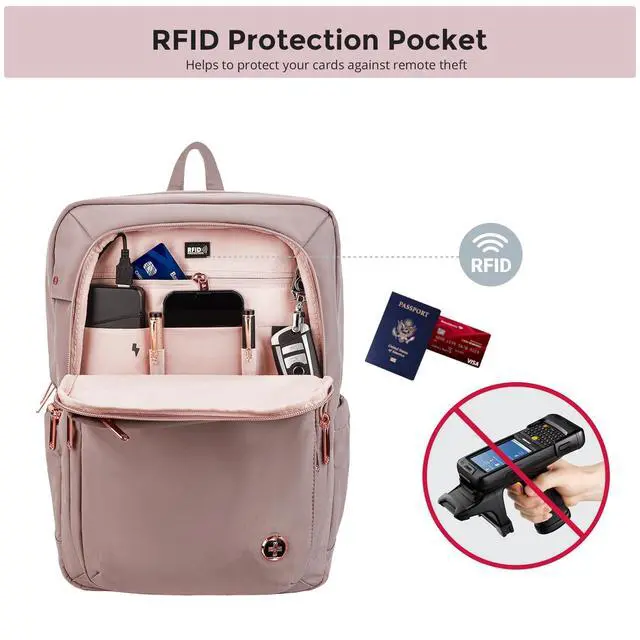 • STYLISH PROTECTION Women backpack made with high quality materials and Swiss Design to provide both style and protection for your belongings. The velvet lined sunglass pocket gives your sunglasses comfort and protection. An RFID pocket protects your credit cards, driver's licenese and passport from electronic snooping