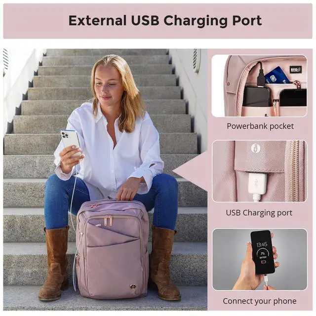 • ALL DAY COMFORT: Adjustable padded straps provide the right women's computer backpack fit to give you comfort all day. The added USB Charging Port provides quick access to charge and use your phone and other USB devices while walking (A powerbank is not included. A special powerbank is not required.Built-In Water Bottle holder provides you w