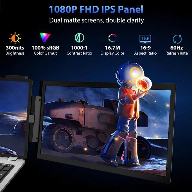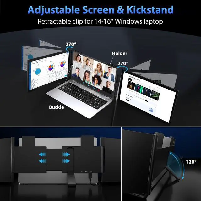 Note: Your laptop's Type-C port needs support for Thunderbolt 3.0 / 4.0 or USB 3.1 Type-C DP ALT-MODE ^^ Vibrant Display Quality - With two 14-inch 1080P FHD IPS matte screens, it boasts 100% sRGB color gamut, 300 nits brightness, and 1000:1 contrast ratio, providing a broader view and more vibrant color. Display settings such as RGB, aspect, and contrast can also be adjusted by the separate OSD menu on each screen as you like. Flicker-free low blue light tech helps greatly reduce radiation damage and relieve eyestrain after a long time of watching. ^^ Flexible & Travel-friendly - Features a 120 kickstand, 270 screen rotation, and individual screen adjustments for optimal viewing angles in any situation. The rubber pad on the bottom greatly reduces the slipping risk and fully supports the whole monitor extender. A stretchable back panel clips the monitor onto your laptop, moving together, and no need to reconnect. 3.19 lbs lightweight, 1.18 -inch slim frame, perfect triple monitor for carrying around. ^^ Come Everything You Need- Package includes 1x Triple Portable Monitor, 2x USB-C to USB-C Cable, and 1x Power Adapter.