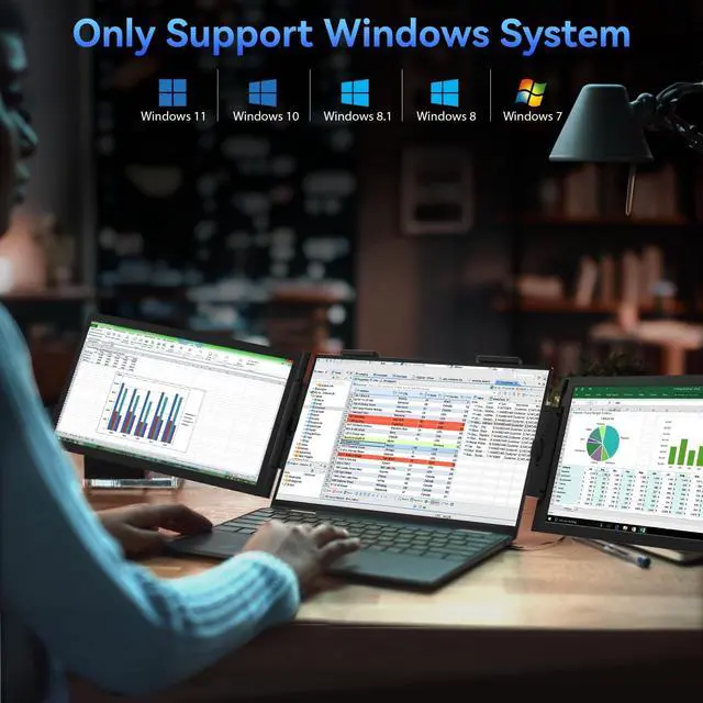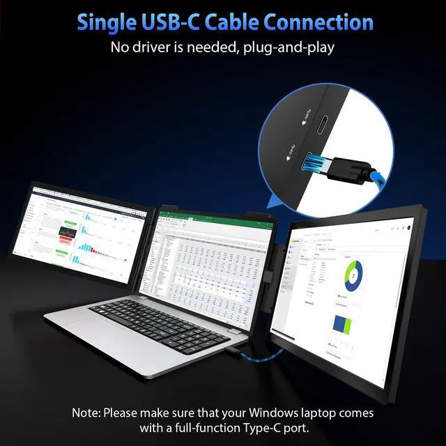 Only Compatible Windows Laptop- HotYeah triple portable monitor is only designed for Windows systems and works well with 14-16" laptops. Use only a single USB-C cable to easily achieve a 1-screen-to-3-screen workstation setup. Sometimes, is there no need for a 3-screen? Dont worry! Each screen of this dual portable laptop monitor can be adjusted, turned off, and awakened individually. It can be both a 2nd screen and a triple monitor, flexibly. ^^ One Cable Plug & Play - HotYeah triple laptop monitor features 2 full-featured Type-C ports. Connect it with a USB-C cable to control both 2 screens at the same time, while traditional dual screens require at least 2 cables for connection.