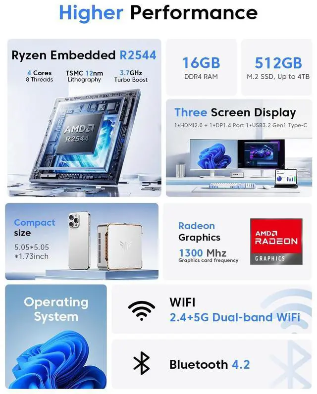 [Powerful AMD Ryzen Embedded R2544 ] The KAMRUI P2 Mini PC is equipped with the AMD Ryzen Embedded R2544 processor. This 4-core, 8-thread CPU features 4MB of L3 cache, a base clock of 3.35 GHz, and a max boost clock of up to 3.7 GHz. The performance is superior to chips such as R5 3500U, R3 4300U, and Intel N97/N150, with a 25% increase in performance, It provides excellent single threaded and multi-threaded performance. This compact system can easily handle complex multitasking and provide excellent responsiveness. ^^ [16GBRAM+512 M.