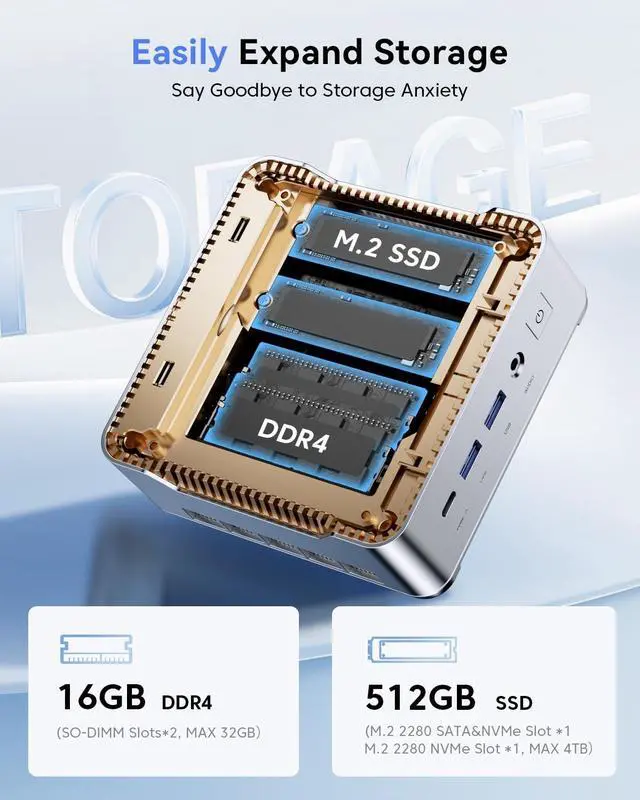 The extended desktop capability allows for seamless multitasking across multiple screens, significantly enhancing productivity, consuming content, and light gaming experiences. ^^ [Designed for maximum scalability ] This mini PC is equipped with Gigabit Ethernet for lightning fast wired connections. Through 6 USB 3.2 ports (5Gbps), 1 USB-C port (data+Display Port 1.4 video output) HDMI 2.0 +DisplayPort 1.3, Gigabit Ethernet and 3.5 mm audio jack provide additional peripheral device support, making it easy to connect with professional devices such as servers and IP cameras, as well as all basic peripheral devices.