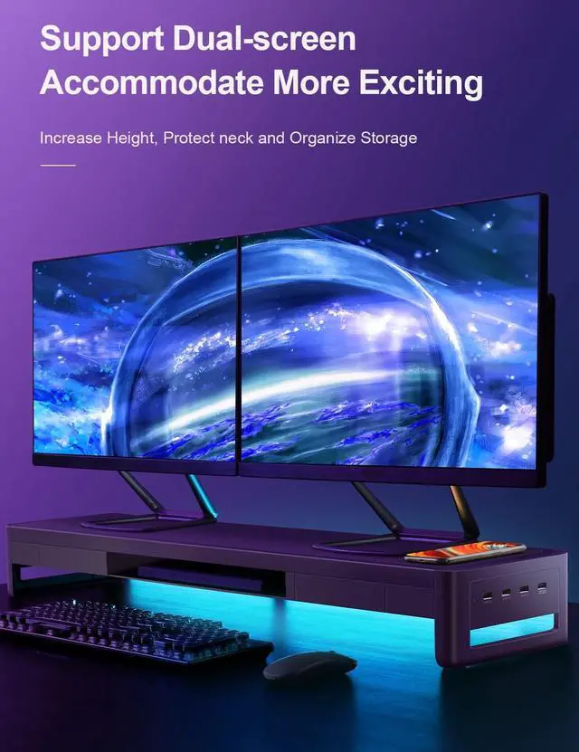 Tips: If your iPhone is properly placed on the charging pad but still can't be charged, please reboot your phone. ^^ Desktop Storage with 2 DrawersOur extra-long monitor stand riser is equipped with 2 pull-out drawers( 5.9 * 6.1 * 1.3 inches), which can store most small office supplies, such as U disks, hard drives, pens, book clips, smartphones etc, keep your desk neat and tidy. An excellent space-saving assistant. ^^ Attentive Customer ServiceCommitted to providing customers with a better shopping experience are our constant pursuit. We sincerely hope to listen to the experience and suggestions of all consumers. Any problem with this monitor stand, you can contact us and we'll offer you a satisfying solution within 24h. ^^ Ideal and Healthy Christmas GiftCorrect posture, protect vision, prevent spinal problems, and enhance work efficiency with the dual monitor stand. Perfect for office, home, school, studio, or game room use. Can be a monitor stand, TV screen stand, or printer stand. Ideal for work, study, gaming, and a thoughtful gift for family, friends, colleagues, and students.