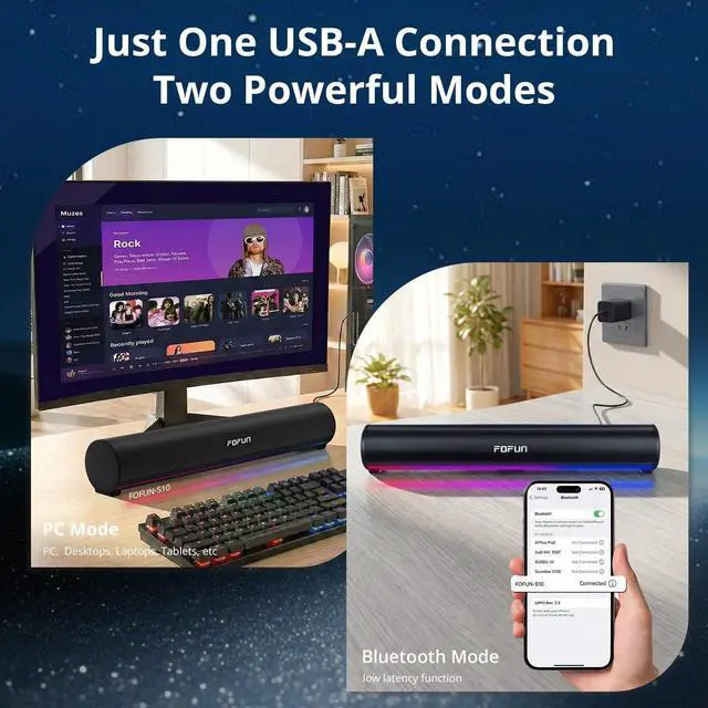 Its slim, all-in-one design fits neatly under monitors or laptops, saving desk space and reducing cable clutter. Perfect for small desks, shared spaces, or minimalist setups, this compact computer soundbar delivers a convenient, stylish, and versatile audio solution for any desktop environment.