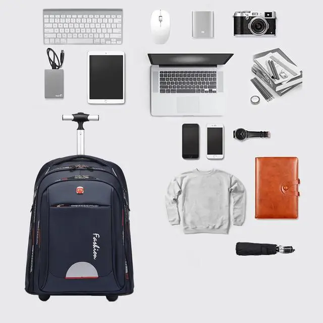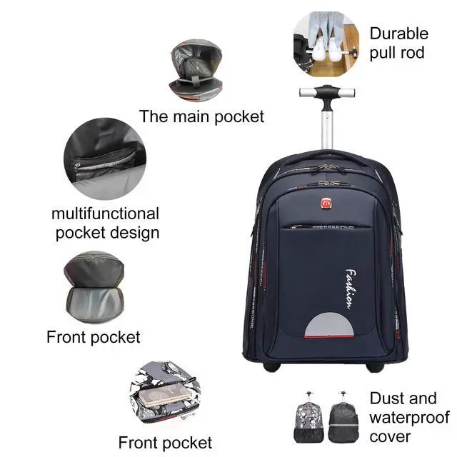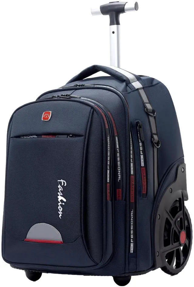 INCH LARGE WHEELED EASY CLIMBING: Rolling Backpack Have 18CM (7inch) Wider large Wheel, steady, heavy loading, saving labour and time, easy thru airplane aisles and stair, do not worry the wheels turned sideways, also do not worry wear off the backpack. ^^ [55L LARGE CAPACITY SPACE] Large rolling backpack size is 19.7 x 14.5 x 13 inches (50*37*33cm). The Padded laptop compartment with Velcro sleeve - 9.6 x 10.6 x 1.57 Inches( 24.5 *27*4cm) holds up to 15.6 Inch 15 Inch and 14 Inch laptop. Large main compartment roomy have 55L, hold 58 books, clothes, documents and folders. Rolling wheel backpack fit everything in it, contain all Kind of Books, Files, Pens, Computer, iPhones, Keys, iPads, Wallets and some small equipment with room to spare. ^^