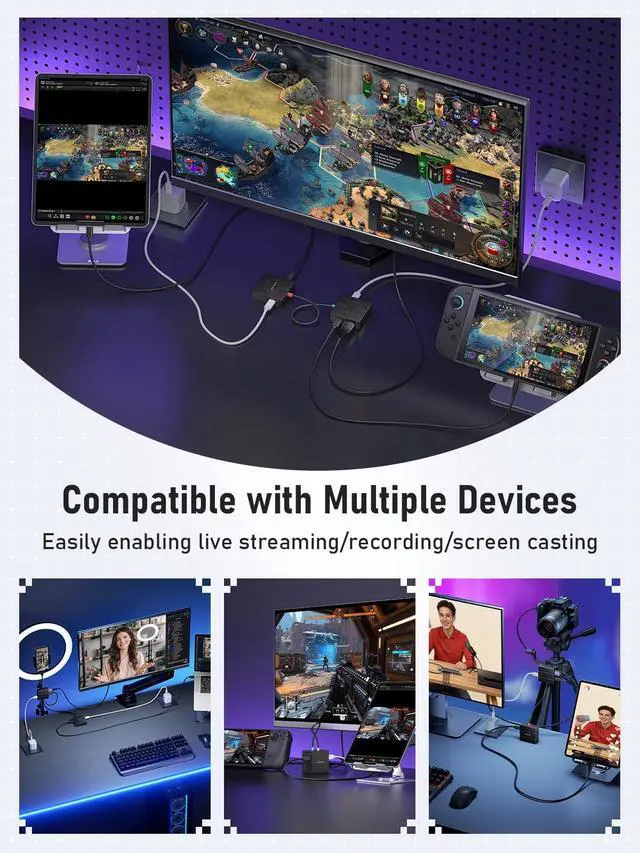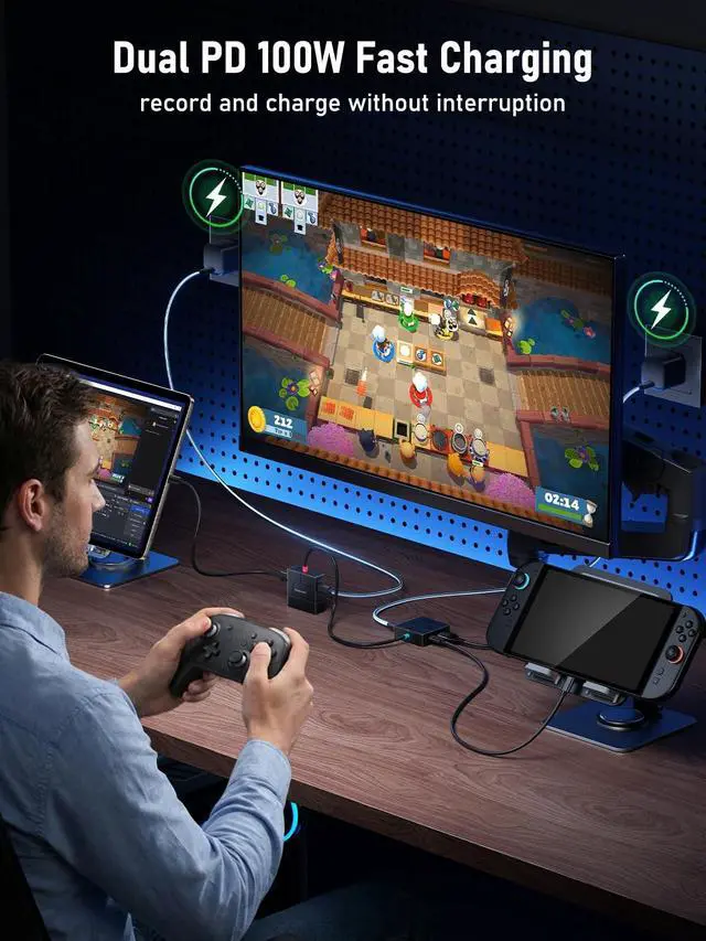 Power While You Play: Dual 100W PD Pass-Through ChargingNever run out of power mid-session. Two USB-C PD ports deliver up to 100W each, allowing you to fast-charge your laptop, phone, or tablet simultaneously while capturingkeeping your setup powered and efficient. ^^ Ultimate Connectivity with HDMI Loop-OutMonitor your content in real-time without any delay. The HDMI loop-out port lets you pass the source signal directly to a second display, enabling perfect composition and confidence monitoring for streamers and presenters. ^^ Universal Plug & Play CompatibilityWorks instantly with Windows, macOS, and Linuxno drivers needed. Seamlessly integrates with popular software like OBS Studio, Zoom, Microsoft Teams, YouTube Live, and more. Ideal for creators, educators, and remote professionals. ^^ Versatile Port Hub for Expanded WorkflowsGo beyond capturing with a built-in connectivity hub. The combination of DP input, USB 2.0, and USB-C data/charging ports allows you to connect multiple peripherals, making it an all-in-one solution for complex streaming, recording, or conferencing setups.