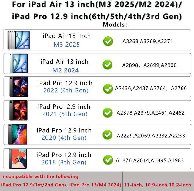 compatible with iPad models: iPad Air 13-inch M3 2025 (A3268, A3269, A3271); iPad Air 13 inch M2 2024 (A2898, A2899, A2900); iPad Pro 12.9 inch 6th Gen 2022 (A2436, A2764, A2437, A2766); iPad Pro 12.9 inch 5th Gen 2021 (A2378, A2461, A2379, A2462); iPad Pro 12.9 inch 4th Gen 2020 (A2229, A2069, A2232, A2233); iPad Pro 12.9 inch 3rd Gen 2018 (A1876, A2014, A1895, A1983); Not for iPad pro 13-inch m4