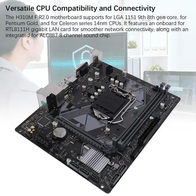 Compatibility and Connectivity: The H310M F R 2.0 motherboard supports for LGA 1151 9th 8th gen core, for Pentium Gold, and for Celeron series 14nm CPUs. It features an onboard for RTL8111H gigabit LAN card for smoother network connectivity, along with an integrated for ALC887 8 channel sound chip. ^^ Efficient Memory and