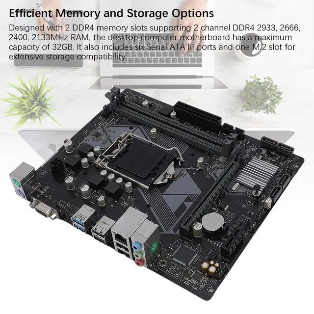 Storage Options: Designed with 2 DDR4 memory slots supporting 2 channel DDR4 2933, 2666, 2400, 2133MHz RAM, the desktop computer motherboard has a maximum capacity of 32GB. It also includes six Serial ATA III ports and. 2 slot for extensive storage compatibility.
