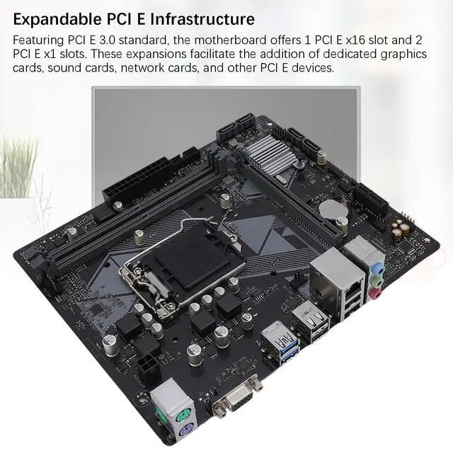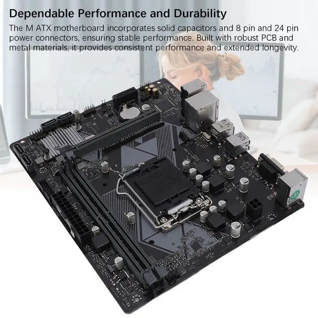 Performance and Durability: The M ATX motherboard incorporates solid capacitors and 8 pin and 24 pin power connectors, ensuring stable performance. Built with robust PCB and metal materials, it provides consistent performance and extended longevity.