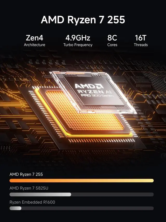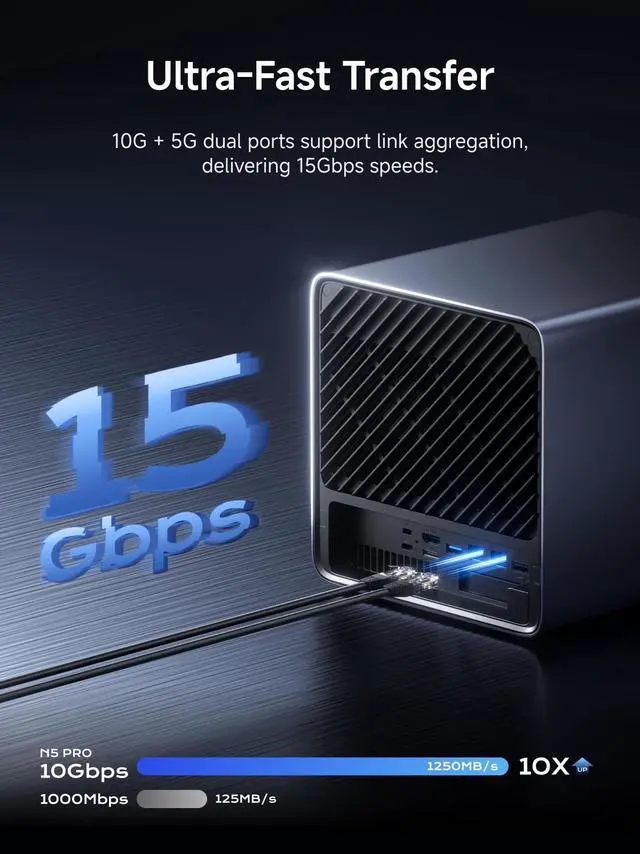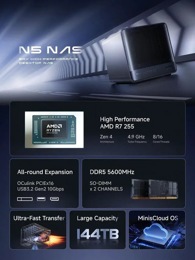 Your Private Database: MINIFORUM NAS N5 features an AMD Ryzen 7 255 processor, running at up to 4.9 GHz with an 8-core, 16-thread processor. It supports multi-user access, simultaneous access to multiple files, and ultra-fast audio and video playback. Say goodbye to the cumbersome operation of traditional hard drives and build your own data management centerwith centralized storage, automatic backup, remote access, and extensive RAID options.