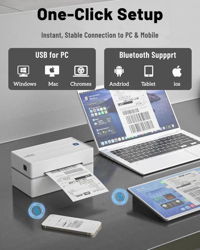 ^^ Multi-system USB wired connectionThe LABEER printer offers seamless USB wired connectivity with full compatibility across Windows 7+, macOS, ChromeOS and Linux systems - it comes with a special USB drive containing the latest drivers, setup videos and FAQ guides for true plug-and-play installation. You'll enjoy stable, high-speed printing perfect for handling bulk jobs and complex tasks with reliable performance. ^^ Wide Compatibility & Multi-FunctionalDesigned to boost your business efficiency. This LABEER thermal label printer works seamlessly with all major e-commerce and shipping platforms including UPS, USPS, FedEx, eBay, Shopify,, and Etsy.