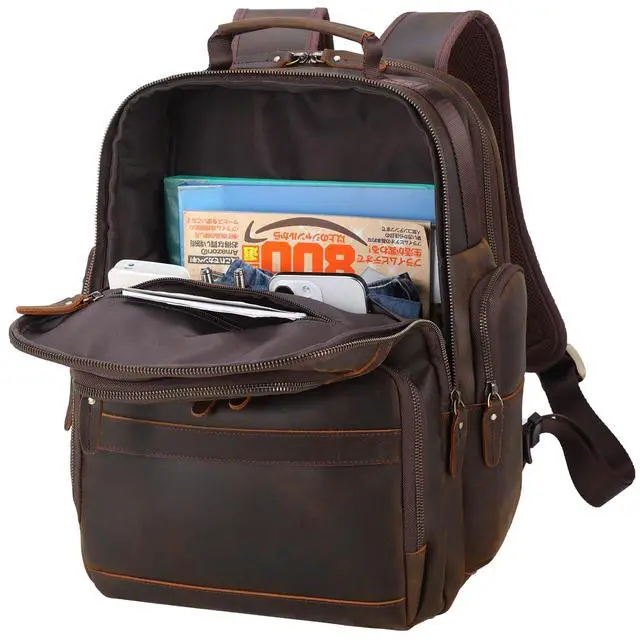 Area: Up to fit 15.6" laptop and 12.9" tabletStructure: Two large main compartments, two front and side pockets, a hidden back zipper pocket and variety of interior pocketsWho it suits for: ideal leather backpack for work, business, travel, casual, overnight, weekender, hiking, camping, etc. About UsTIDING is an original and handmade brand since 1988. Each bag is designed by us and handcrafted by experienced and well skilled artisans. Our products combine function and style, presenting a unique look that is elegant and retro. We provide users with high quality of products and high-Effective service. About Full Grain Cowhide LeatherFull grain leather can retain the natural texture and pores of leather, a slight bending on the skin will produce a discoloration effect. The leather surface has disordered wrinkles and scratches, giving it a unique and retro style. Over time and with usage, it will become "brighter" and "newer". Leather InstructionsEasy to produce scratches during use, but scratches will disappear after rubbing the surface with your finger or colorless leather oil/conditioner. Leather SmellIt has a natural leather smell that will disappear after a few days in a dry, cool, ventilated place.