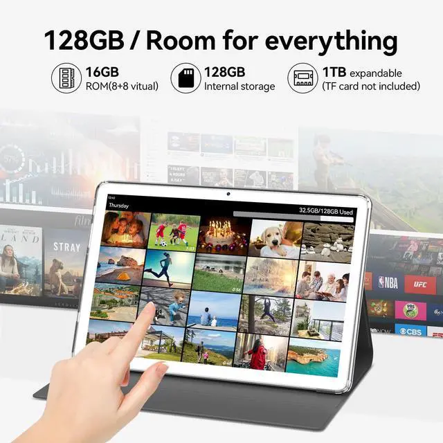 128GB +16GB ^^ Snap More, Delete LessThis Android tablet is equipped with 16GB RAM(8+8 virtual memory expansion), ensuring a fast and smooth entertainment experience. With 128GB of built-in storage, this 10 inch tablet can store all your family vacation photos, cute puppy videos, your favorite games, and work files. (1TB expandable via microSD card (sold separately) ) ^^ Octa-Core CPUThis Android tablet is powered by MTK8183 2.0G hz Octa-Core processor, delivers powerful performance in entertainment and multitasking, while the Mali-G72 MP3 GPU provides fast graphics. The 10 inch tablet updates to the Android 13 system and has GMS certification.