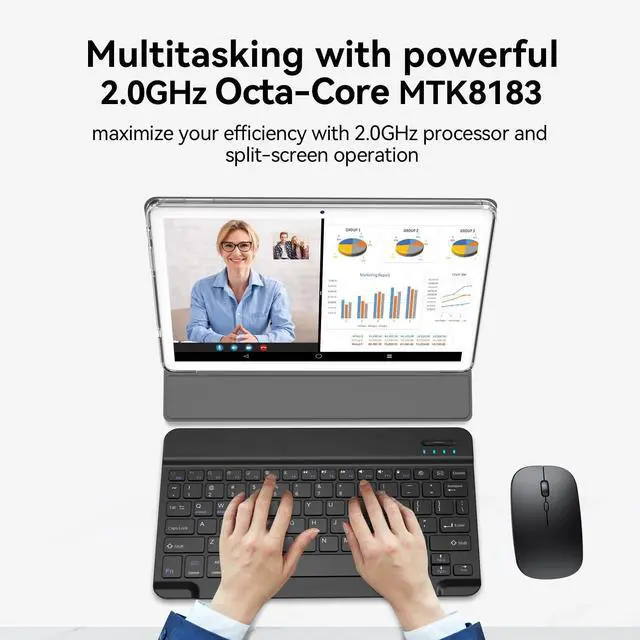 The tablet with keyboard upgrade a 10.1" IPS LCD screen provides a wide 178viewing angle, bringing your photos and videos to life. ^^ Multiple Accessories & 7000mAh Large BatteryThis 2 in 1 tablet comes with a wireless Bluetooth keyboard, wireless mouse, foldable case, stylus, charger, and USB-C cable. You can use it as a laptop tablet in emergency situations. 7000mAh long-lasting battery ensures you go unplugged for hours to keep the family fun going. This tablet with keyboard provides up to 10 hours battery life for reading and daily use.