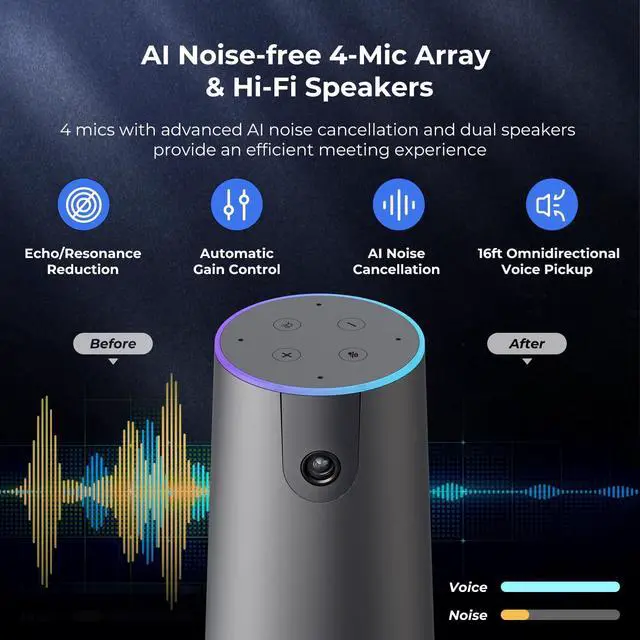 Mic Support: Built with a 4-microphone array and an integrated full-duplex speaker, 120 Max captures voices clearly within a 5-meter radius. The advanced AI noise cancellation suppresses keyboard clicks, air-conditioning noise, and background chatter for crystal-clear dialogue. For larger rooms, connect the included external microphone to expand pickup range without sacrificing quality or clarity. ^^ Plug-and-Play Setup, Enterprise