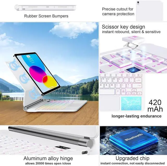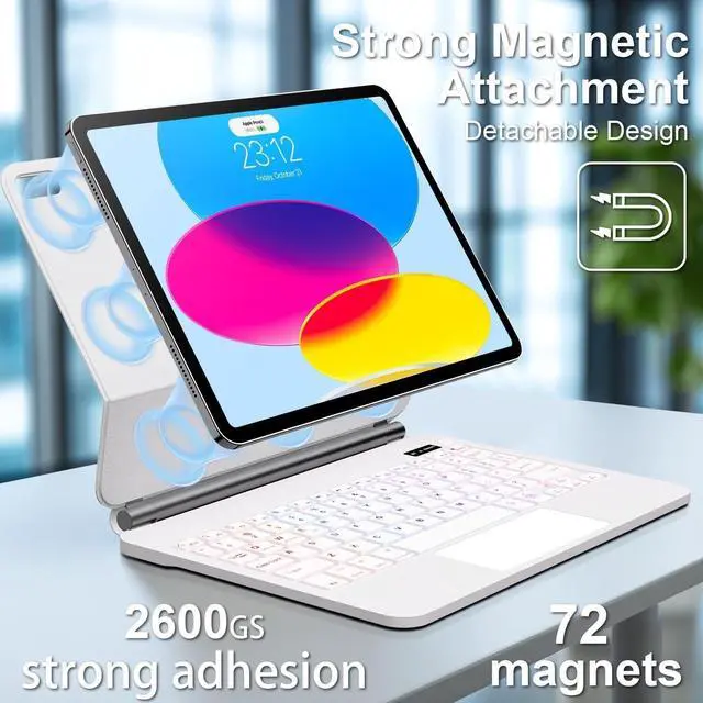 NOTE: NOT FIT FOR IPAD AIR 13(M3 2025 /M2 2024). Please check your tablet model before purchasing. ^^ Exclusive Magnetic Stand with Adjustable Angles The magic-style floating cantilever stand and strong magnetic attraction hold iPad firmly and stably in place like a laptop. The floating cantilever design offers customizable viewing angles ideal for typing, reading, and multimedia consumption, making it perfect for travel, work, and daily use. ^^ High-Precision Multi-Touch Trackpad Enhances productivity with an ultra-responsive smart trackpad supporting multi-finger gesturestap, pinch, scroll, and swipefor seamless navigation, document editing, web browsing, and presentation control. ^^ Backlit Keyboard with