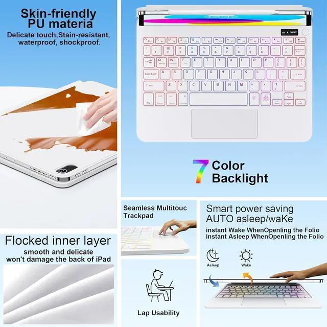 Rechargeable Battery: 7-Color Backlit Keyboard Case for iPad Pro 13 inch (M4) 2024From dawn to dusk, adapt effortlessly! Adjusting 7 backlight and 3 levels of brightness ensures clear visuals in every setting, enhancing your immersive experience. ^^ Ultimate Typing EaseEnjoy a refined typing experience with advanced scissor-switch keys that respond to even a light touchactuating halfway for smooth, quiet entry with no missed keystrokes. A full row of dedicated shortcut keys puts media playback, volume, and screen controls at your fingertips. Type comfortably and efficiently, enhancing your workflow wherever you go! ^^ Auto Wake/Sleep Function & Slim Protection Automatically wakes or sleeps the tablet when opening/closing the case, conserving battery life. The folio design provides full front and back protection while maintaining a slim profile for portability. ^^ Lifetime Technical Support Backed by lifetime technical assistance. Includes a Bluetooth keyboard, type-C cable, quick-start guide, and detailed manual for seamless setup.