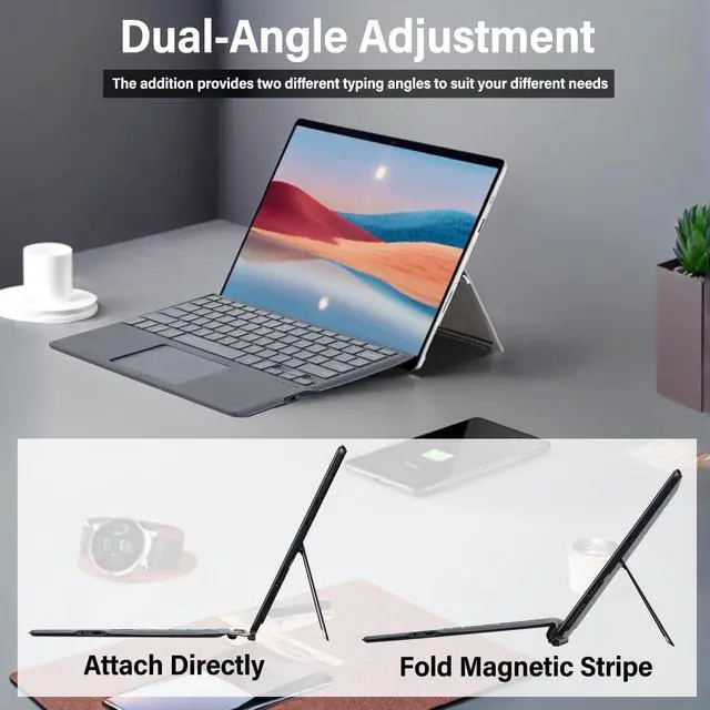 ^^ Two Angles Selection: This surface pro type cover can be adjusted at two different angles. The design of the magnetic attachment strip and nonslip keyboard back can hold your tablet steadily, making your surface pro keyboard work like a laptop for more comfortable typing and viewing. ^^ Multi-Touch TrackpadOur integrated multi-touch trackpad perfectly adapts to Win system, with plentiful trackpad gestures, delivering a comfortable user experience while allowing you to click, scroll, and swipe through content effortlessly. ^^ Magnetic Detachable Wireless Bluetooth KeyboardThis surface pro keyboard supports 33ft/10m long-distance connection. Stable 5.3 Bluetooth connection to the device, so you can use the surface pro keyboard and tablet separately, which is a convenient when using the device.