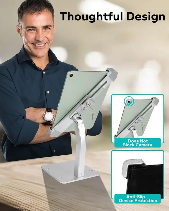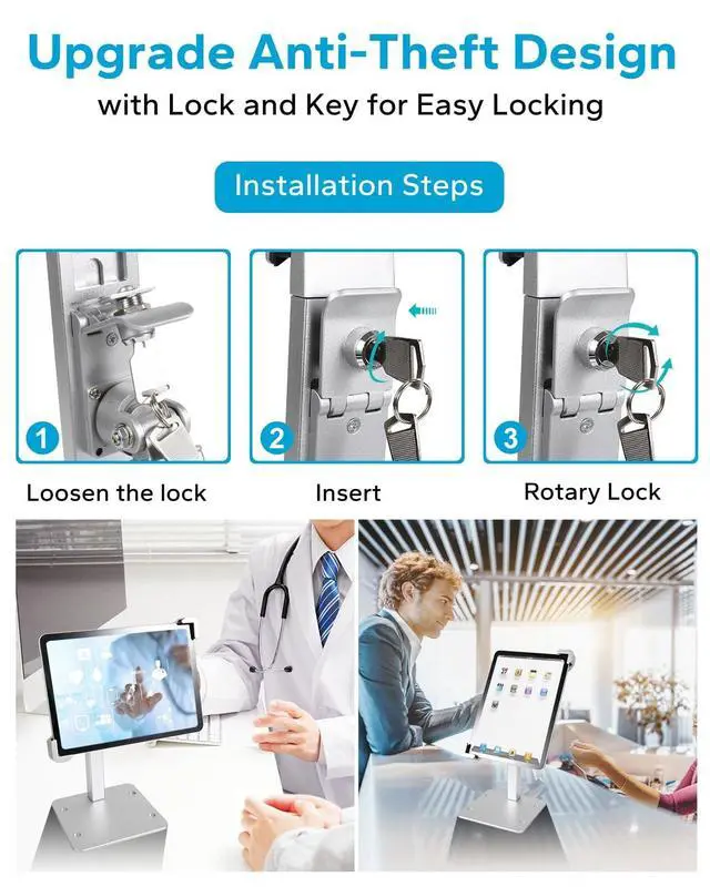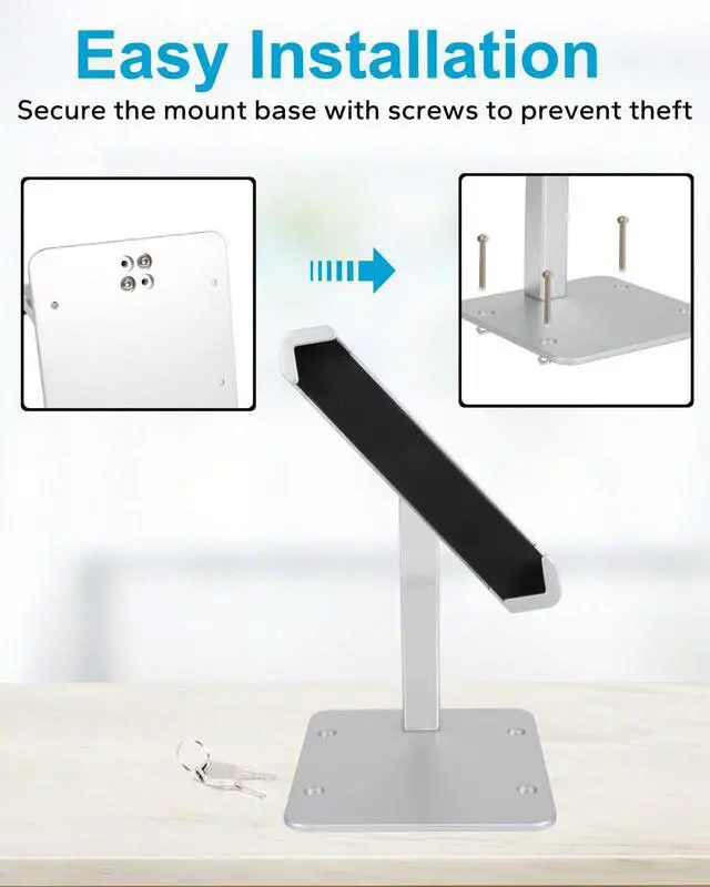 Upgraded Anti-Theft DesignThis secure POS tablet stand features a diagonal locking mechanism with theft proof screws to prevent theft and unauthorized removal. Enjoy peace of mind in busy environments while ensuring your tablets remain accessible for use. ^^ Commercial Use ScenariosDesigned for business environments, this lockable desktop tablet stand is perfect for POS systems, retail stores, checkout counters, hotels, restaurants, service desks, conference rooms, trade shows, cafes, libraries, schools, churches, and more. It enhances customer communication efficiency and streamlines service workflows, making it an ideal tool for busy commercial settings.