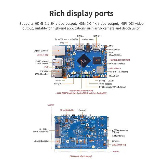 ^^ 8K Video Decoding - 8K video decoding for clear and realistic picture. With support for up to 8K@60Hz, the powerful video codec allows for clearer images and more detailed picture quality. ^^ WiFi5+ BT 5.0 with BLE Support - Orange pi 5 pro 16G Built-in 2.4G /5G dual-band Wi-Fi5 and Bluetooth 5.0 with BLE support for stronger and more stable signals and easier and faster network transmission ^^ Rich Ports - The Orange Pi 5 Pro provides abundant interfaces, including HDMI output, GPIO ports, USB 2.0, USB 3.1, 3.5 mm headphone socket, Gigabit LAN port with PoE+ support (PoE+ HAT required), etc.