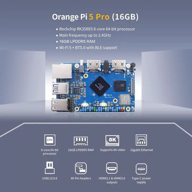 , with an M. 2 M-key slot that supports the installation of NVMe SSD or SATA SSD. ^^ Wide Range of Application Scenarios - Orange Pi 5 Pro 16GB is compact, measuring only 89mmX56mmX 1.6 mm, and powerful enough to be widely used in tablets, edge computing, artificial intelligence, cloud computing, AR/VR, intelligent security, smart home and other fields, covering AIoT various industries. ^^ Orange Pi Single Board Computers can builed a computer, a wireless server, Games, music and sounds, HD video, a speaker, Android, Scratch.