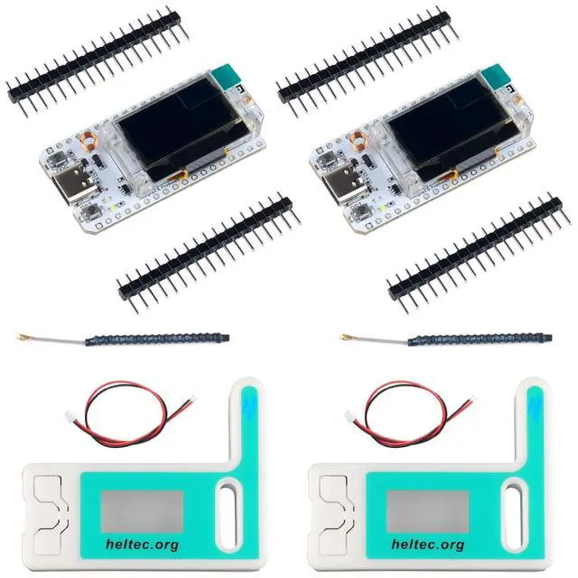 What you will get: 2 X ESP32 Lora V3 OLED development board + 2 X 915MHz U. FL/I-PX to SMA Connector Antenna + 2 X JST 1.25 mm-2P Connector + 2.54 pin (no welding) + 2 X Shell