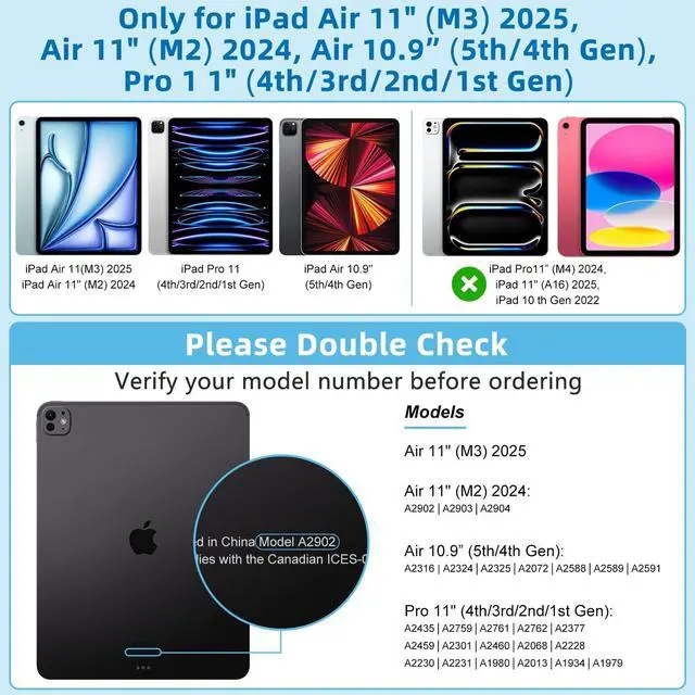 Compatibility: This premium slim keyboard case is perfectly compatible with 2025 M3 iPad Air 11-inch (A3266, A3267, A3270), 2024 M2 iPad Air 11-inch (A2902, A2903, A2904), 2022 iPad pro 11 inch 4th generation (A2435, A2759, A2761, A2762), 2021 iPad pro 11 inch 3rd generation (A2377, A2301, A2459, A2460), 2020 iPad pro 11 inch 2nd generation (A2228, A2068, A2231), 2018 iPad pro 11 inch 1st generation (A1980, A2013, A1934, A1979), 2022 iPad air 5th generation (A2588, A2589, A2591), 2020 iPad air 4th generation (A2072, A2316, A2324, A2325).